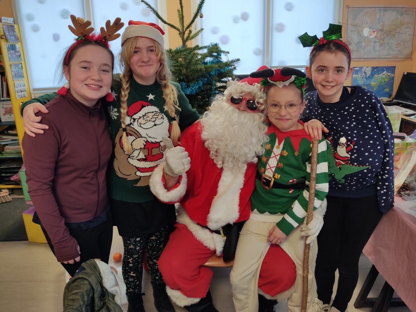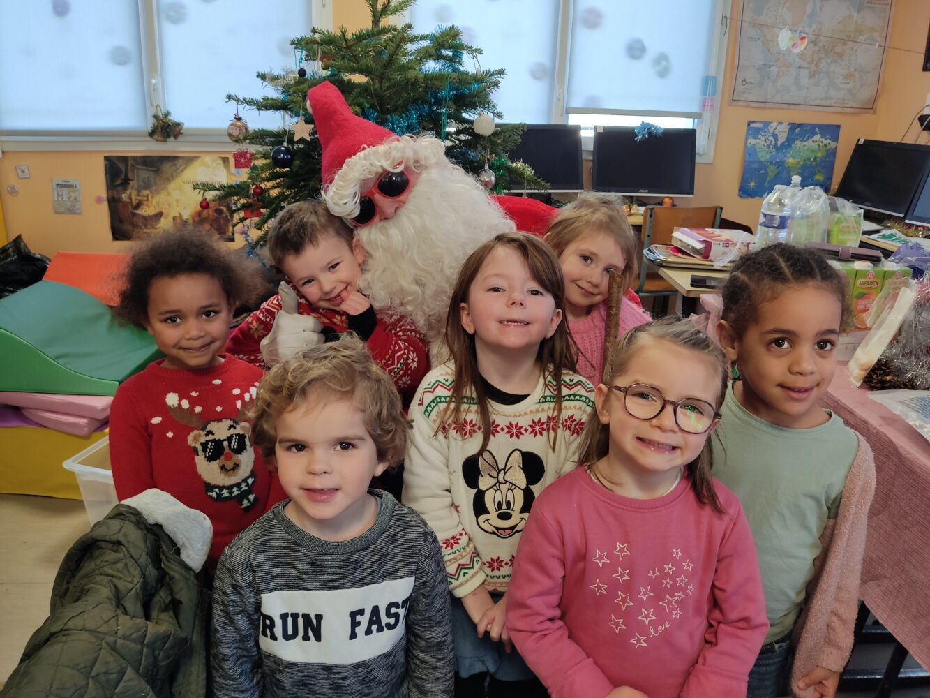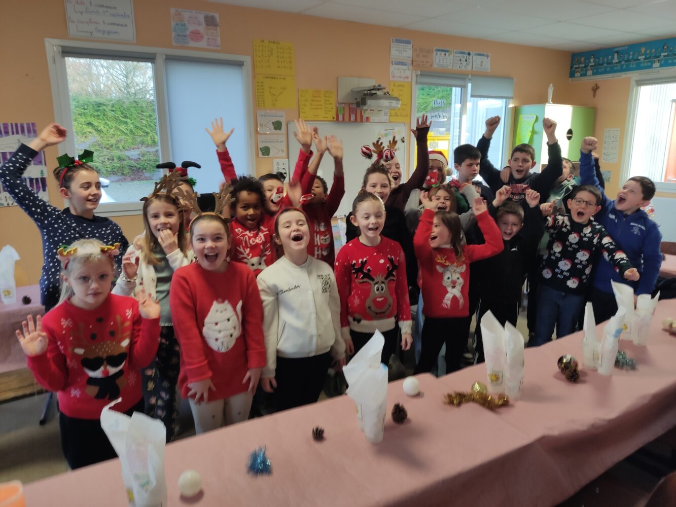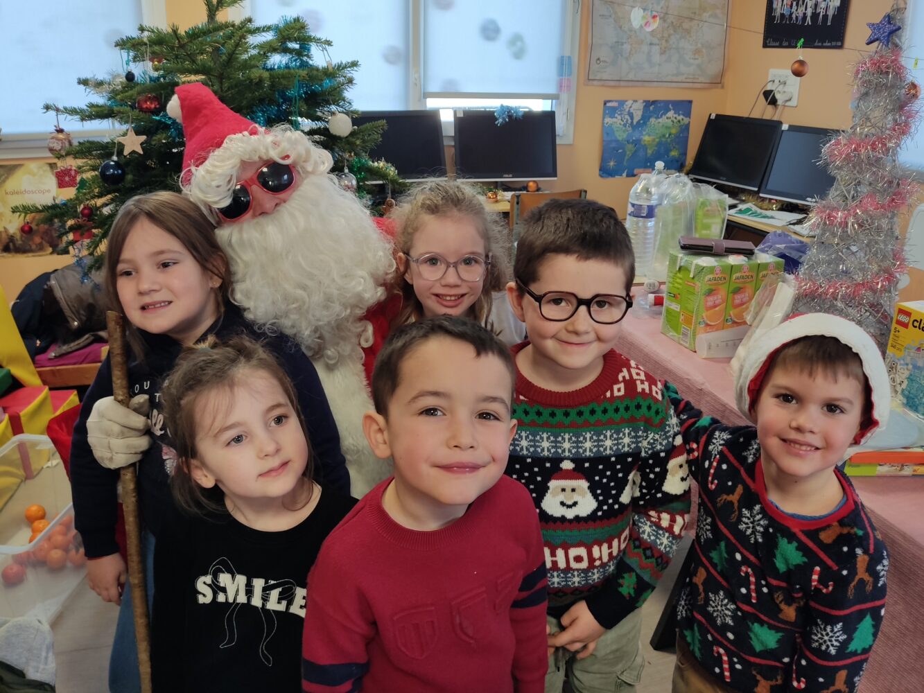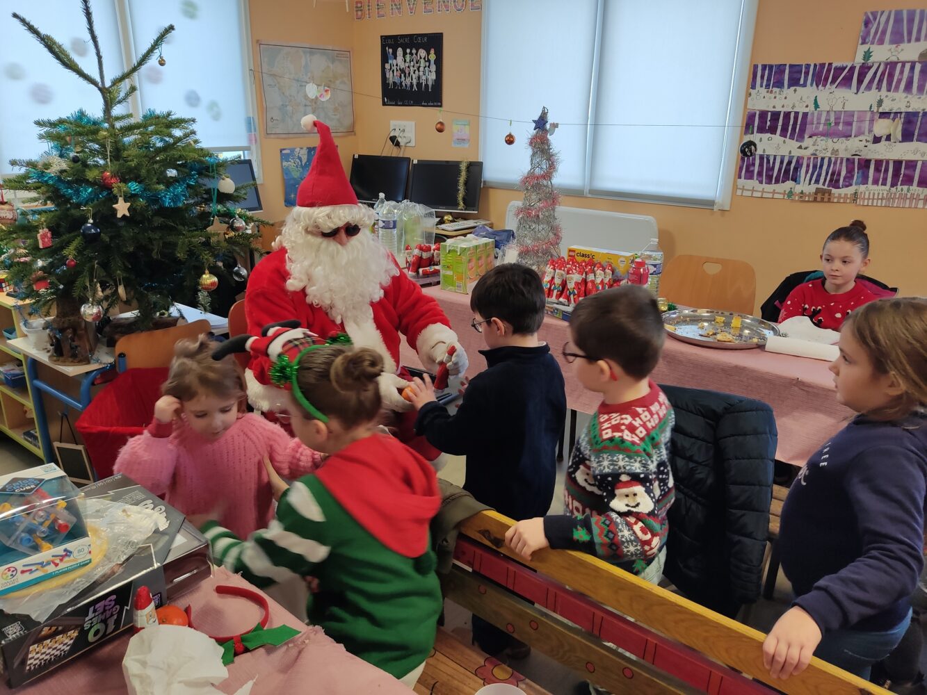 La veille des vacances, les grands ont préparé le goûter de Noël dans leur classe. Nous avons eu la visite surprise du Père Noël qui avait garé son traineau sur l’herbe du terrain de foot. Il nous a apporté des cadeaux fabuleux. Merci Père Noël!